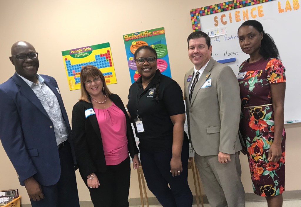 The day begins with about 25 business professionals here at Imagine Elementary at North Lauderdale. Each student has to go through an obstacle course, spending 1 minute interacting with each professional. When the student walks away, the professionals score the child based on handshake firmness, eye contact, confidence, common sense, etc.